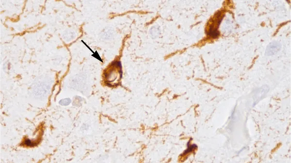 Wikimedia Commons: Abnormal accumulation of tau protein in neuronal cell bodies (arrow) and neuronal extensions (arrowhead) in the brain of a patient who had died with Alzheimer's disease.